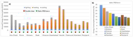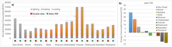 (a) Annual energy consumption due to lighting, heating and cooling of a residential building equipped with double clear or static IRB glazing at various locations; (b) annual energy consumption improvement of static IRB glazing in comparison to clear glass for various locations.