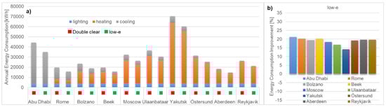(a) Annual energy consumption due to lighting, heating and cooling of a residential building equipped with double clear or low-e glazing at various locations; (b) annual energy consumption improvement of low-e glazing in comparison to clear glass for various locations.