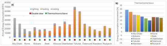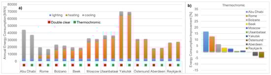 (a) Annual energy consumption due to lighting, heating and cooling of a residential building equipped with double clear or thermochromic glazing at various locations; (b) annual energy consumption improvement of thermochromic glazing in comparison to clear glass for various locations.