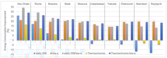 By comparing the five energy-efficient glazing systems for each location individually, a clear trend can be observed. For hot and warm climates with either no heating costs (Abu Dhabi), higher cooling than heating costs (Rome) or only twice the annual heating to cooling demand, the static IRB/low-e glazing provides the highest annual energy consumption improvement of all energy-efficient glazing solutions (Figure 11). Here, the high reduction in annual cooling demand—between 37% and 51%, due to the low solar heat gain—in combination with annual heating demand reduction between 11% and 15%—due to the low-e properties—leads to a total annual energy consumption improvement over clear glass of between 24% and 34%. In these regions, the impact of reducing annual cooling costs on the total annual energy consumption is much higher than the impact reduced annual heating has. Therefore, the glazing system with the highest reduction in annual cooling demand has the best overall performance, even if other glazing systems, such as pure low-e, have a higher impact on the annual heating demand. The second-highest performance (23–29% total annual energy reduction) in these regions is attributed to the combination of thermochromic with low-e, where the high reduction of annual cooling (between 32% and 40%) is combined with a high reduction of annual heating (between 20% and 22%), even though the solar heat gain reduction is not high enough to reach the values of the static IRB/low-e glazing. For the hottest region, the static IRB glazing shows the third-highest annual energy consumption improvement of 26%. Due to the intense performance decline for regions where heating starts playing a role, this is surpassed already for Rome by the low-e glazing; the static IRB glazing reduces the annual energy consumption by 17%, whereas the low-e glazing shows 20% annual energy consumption improvement. This trend continues, so that at Bolzano, IRB glazing shows a 7% annual energy consumption improvement, which is only a slightly better performance than the thermochromic glazing at 6%, which has the lowest annual energy consumption improvement of all studied glazing systems in hot regions.