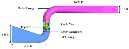 Some scholars also apply this technology in the research of hydraulic turbines. Tian et al. [15,16] studied the application of VGs by numerical simulations and experiments based on a model draft tube. Their results show that by choosing the optimal VG parameters, such as the installation type, installation position, blade-to-blade distance, and blade inclination angle, the draft tube-equipped VGs can effectively raise the static pressure recovery coefficients and working stability. Existing research results fully show that the control effect of a VG. Therefore, to reveal the change trend of an inlet vortex and its influence on an axial-flow pump, this paper proposes installing fixed VGs in front of the impeller to generate a stable inlet flow vortex.