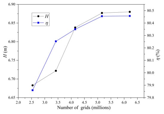 The entire computing domain includes the inlet passage, vortex generators, the impeller, the guide vane and the outlet passage. According to the design parameters, to generate a three-dimensional model for the inlet passage, the guide cone and the outlet passage, and to divide the hexahedral structured grid for them using the ICEM software; the mesh growth rate of the boundary layer was 1.1. The impeller and guide vane are directly divided into structural grids in the TurboGrid software, which can automatically adapt to the span wise change in the blade shape. The impeller is the core of the pump, and a large number of studies have shown that the tip clearance and the y+ value of the grid affect the calculation accuracy directly, which has an effect on the performance of the pump [24,25,26]. In this paper, the tip clearance was set to 0.2 mm, and the y+ value of the wall of the impeller was calculated to be 20 in post-processing. Under the design flow condition, the efficiency of the whole pump device was verified by grid independence; the results are shown in Figure 4.