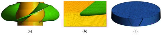 Figures of grids: (a) Impeller; (b) Grid refinement of impeller tip; (c) VGs.