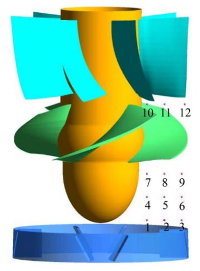 To compare the changes in the flow field in the pump before and after installation of the VGs, pressure pulsation monitoring points were set up at the inlet and outlet of the impeller; the positions of the monitoring points are shown in Figure 6.