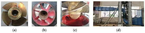 The flow passage parts of the experiment were processed according to the size of the numerical simulation. The impeller was made of brass and was processed by computerized numerical control technology molding. The guide vane, elbow inlet passage and straight outlet passage were made of steel by welding. The models of the impeller, guide vane, VGs and pump device for the experiment are shown in Figure 8.