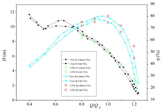 The experimental results show that the flow-head and flow-efficiency curves with and without VGs are basically the same. With the VGs at the impeller inlet, which will directly affect the performance of the pump device, under the design flow condition, the head is reduced by approximately 0.3 m, and the efficiency is reduced by approximately 4.0%. The numerical simulation results under the design flow condition with and without VGs are all in good agreement with the experimental results, but the numerical simulation results are slightly higher than the experimental results for large flows. The reason for the error in large flows may be that the roughness of the boundary conditions for the numerical simulation and the experiment are not identical. With the increase of flow rate, the friction loss of water and side wall increase, while the head corresponding to a large flow rate is low, and the proportion of hydraulic loss is large, resulting in the calculation error for large flows. This paper mainly analyzes the variation in the vortex in the pump under design conditions and its influence on the pump performance. Therefore, the external characteristic results of the numerical simulation can be considered reliable.