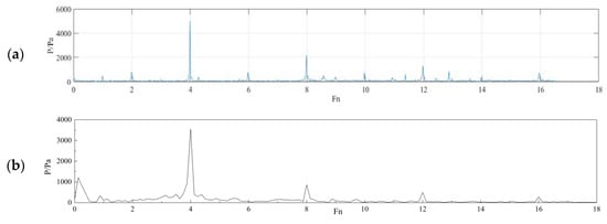 Frequency-domain diagram of the pressure fluctuations: (a) Experiment; (b) Numerical simulation. Fn in the figure is a multiple of the impeller rotation frequency.