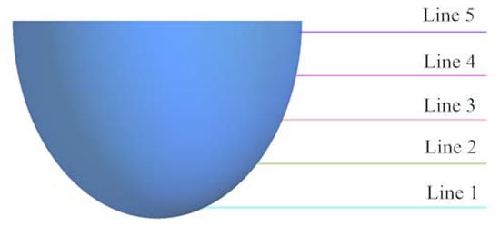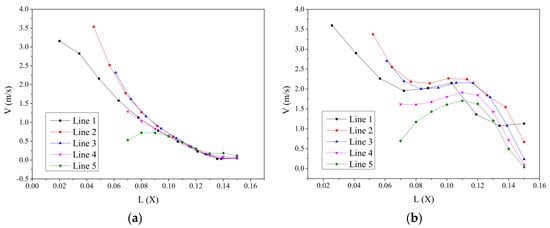 Under the design flow rate, 5 measurement lines were taken before the impeller inlet to compare the differences in the radial velocity. The positions and velocities of each measurement line are shown in Figure 12 and Figure 13. The X-coordinate value in the figure is the horizontal distance between each point and the hub center.