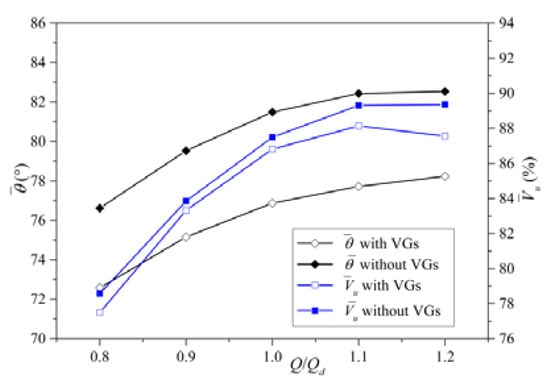 As shown in Figure 14, without VGs, and increase with an increasing flow rate; with VGs, increases with an increasing flow rate, while first increases and then decreases. Overall, without VGs, the smaller the flow rate is, the flow pattern at the inlet plane is more disordered, which conforms to the characteristics of a general axial-flow pump. With VGs, the disturbance of the vortex generator to the flow state is significant, and presented the trend of the larger the flow, the more serious the disturbance. When the size of the VGs is fixed, with the increase of the flow rate, the effect of blocking water increases, the intensity of the generated vortex is stronger, and the damage to the flow field is greater.