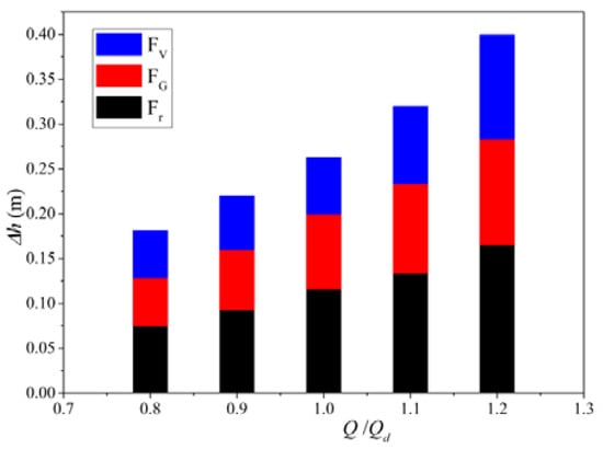 When water passes through the flow parts, such as the inlet and outlet passages, friction, impact, vortices and backflow will occur [27]. Such losses are called the hydraulic loss, which is an important factor affecting the performance of the pump device, expressed as follows: