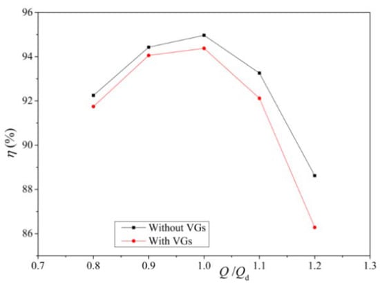 The inlet flow field directly affects the impeller performance. The impeller efficiency in different working conditions with and without VGs was obtained as shown in Figure 16.