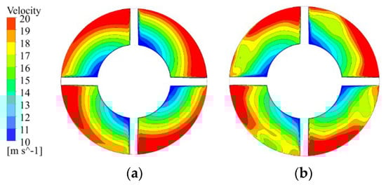 Axial velocity distribution diagram inside the guide vane: (a) Without VGs; (b) With VGs.