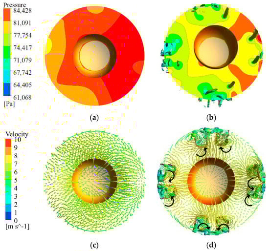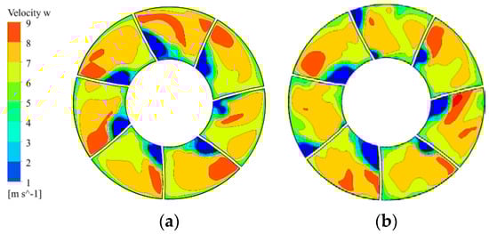Figure 18 shows that in each channel of the guide vane there is a low axial velocity zone in the back of the blades. An uneven velocity distribution and a large velocity gradient can easily cause flow instabilities. When an inlet vortex occurs, the zone of low axial velocity near the hub decreases, and a few channels appear low axial velocity near the shroud. According to Equation (8), the calculated values of for Figure 18a,b are 74.5% and 76.1%, respectively. This indicates that the inlet vortex will influence the interior flow fields of the guide vane; however, the effect is limited. In addition, appropriate flow pattern interference may improve the inner backflow of the guide vane, and this effect is also worth further study.