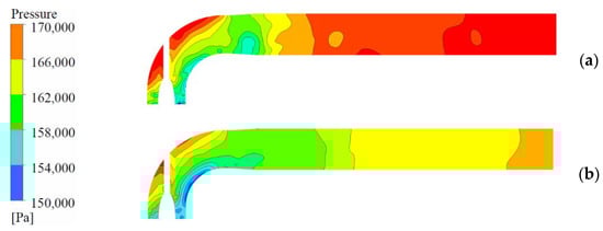 The outlet passage is an important part of the pump device, and its internal flow pattern directly affects the efficiency and stability of the pump device [29]. The pressure contour of the middle section of the outlet passage was obtained, as shown in Figure 19. The pressure cloud diagram of the outlet passage shows that the lateral pressure is high in the turn section, while the internal pressure is low. The pressure gradually increases from the inlet to the outlet of the outlet channel, indicating that the energy of the flow is converted from kinetic energy to pressure energy. The pressure distribution trends with and without an inlet vortex are basically the same, but the pressure values are slightly different, which may be caused by the different abilities of the impeller to work. The inlet vortex has little effect on the performance of the outlet passage.