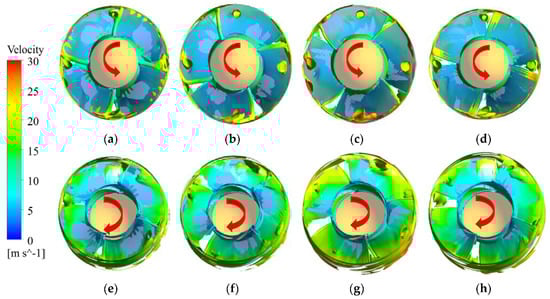 Velocity distribution diagram inside the impeller: (a) Without VGs; (b) With VGs.