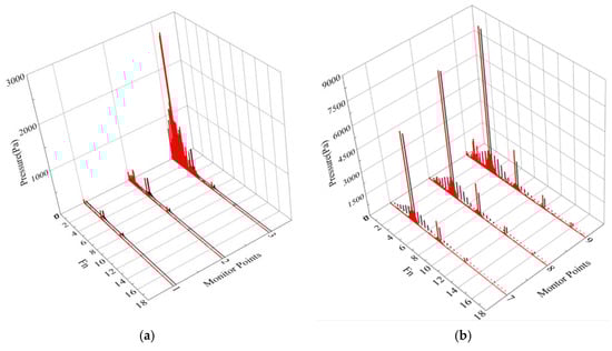 As shown in Figure 28, the amplitudes at 0–1 times the rotation frequency caused by the vortex are larger. The maximum values at points 3′, 6′ and 9′ are 1632 Pa, 1961 Pa and 1547 Pa, respectively. When a measurement point is closer to the impeller, the blade frequency of the pressure fluctuation caused by the vortex significantly increases, and the number of low-frequency pressure fluctuations is greater. The vortex at the inlet can be inferred to interact with the impeller; although the intensity of the vortex weakens near the impeller, the influence of the impeller rapidly increases.