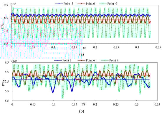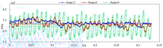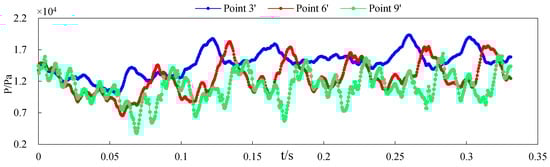 The pressure fluctuations at points 3′, 6′ and 9′ were obtained, as shown in Figure 26.