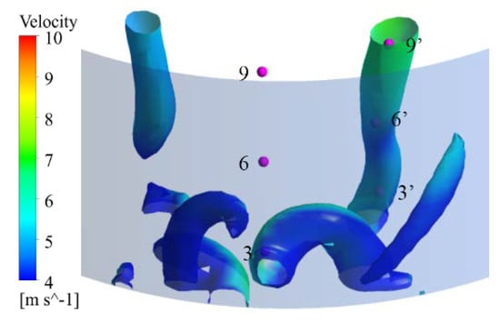 Considering that the pressure fluctuation of a monitoring point may be related to the vortex position, along with Figure 23 and Figure 24, the vortex diagram for q = 6.0 × 104 s−2 was obtained, as shown in Figure 25. To verify this conjecture, three monitoring points 3′, 6′ and 9′ were added inside the vortex, and the Z-axis coordinates of these three points correspond to those of points 3, 6 and 9, respectively. The positions of the points relative to the vortex are also shown in Figure 25. The VGs produces a lot of very disordered vortices, but they are not fully displayed due to their low intensity. In addition, many vortices disappeared before they entered the impeller but the disturbance of the convection field does not disappear. Because this paper focuses on the interaction between the vortices and the impeller, the mechanism of the VGs is not studied in depth here.