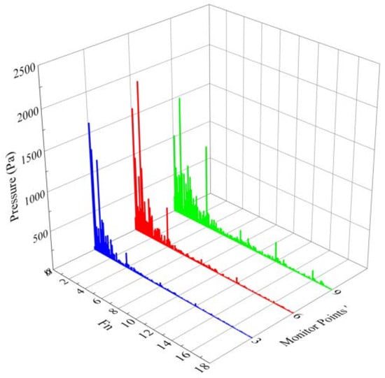As shown in Figure 27, large periodic fluctuations occur in the pressures at the three points. As the position of a measurement point moves toward the impeller, the absolute value of the pressure fluctuation caused by the vortex decreases, and peaks and troughs influenced by the blades gradually appear. The data shown in Figure 27 were transformed by the FFT method, and the frequency-domain diagram is shown in Figure 28.