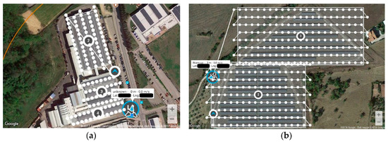The flight plans designed using the SkyDirector app, for the aerial data acquisition. (a) and (b) depict the flight plans used for Plant A and Plant B, respectively.