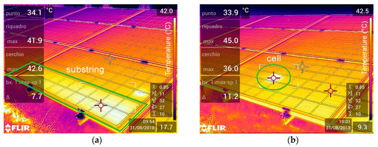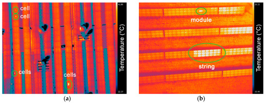 Thermal images collected from UAV. (a) Example of overheated cells, also called a hotspot, (Plant A), and (b) an example of an overheated module and string (Plant B).