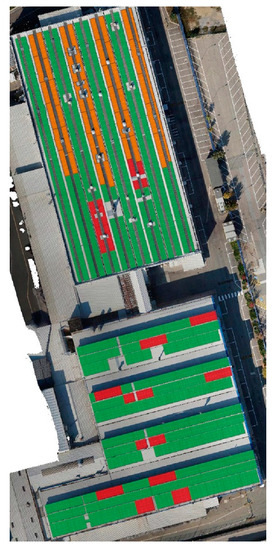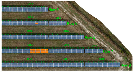 The thermal photos captured with the Flir Tau 2 640 are saved in “TMC” format. These files are readable by ThermoViewer that allows viewing the images in false colors, choosing among different color scales and configuring minimum and maximum temperatures to show [42,43]. Nevertheless, it takes an enormous amount of time and effort for the report production. In fact, in order to redact a classic inspection report, an expert technician must analyze the thermal images in sequence to identify the overheated components, using the flight plan as a help to understand which part of the plant is shown. Every overheated module, string and field must be noted on a map (Figure 5) and listed on a table, with an identification system and the indication of the thermal images in which they are visible.