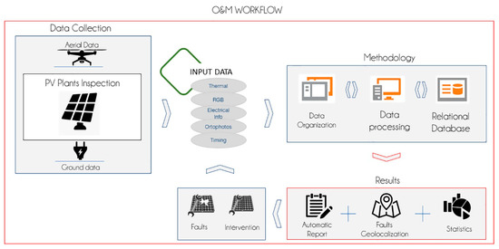 Workflow of the methodology adopted for the O&M in PV plants. The pipeline starts with the data acquisition from aerial and ground sources; such data are the input managed within the GIS solution, following the relational conceptual model. As a result, the user can extract all the information for a more efficient O&M. O&M is seamless, as data can be constantly updated.