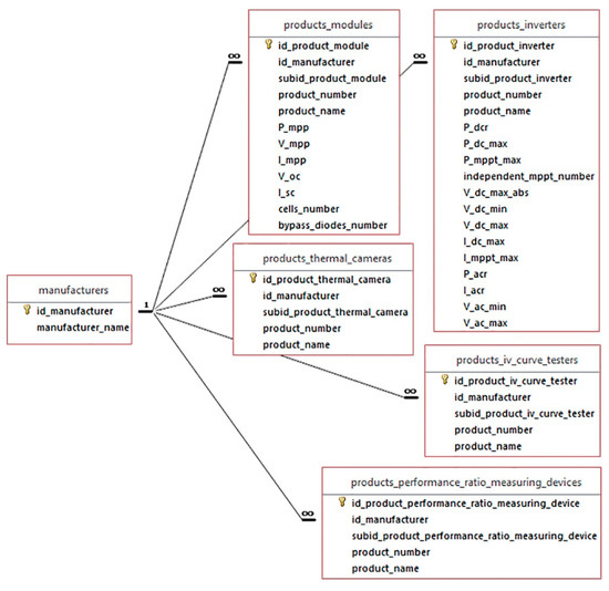 The group about the products consists of the “manufacturers”, “product_inverters”, “product_modules”, “products_thermal_cameras”, “products_iv_curve_testers” and “products_performance_ratio_measuring_devices” tables (Figure 8). It is useful to keep track of the commercial products that have been used to build the plants and to perform tests and inspections.