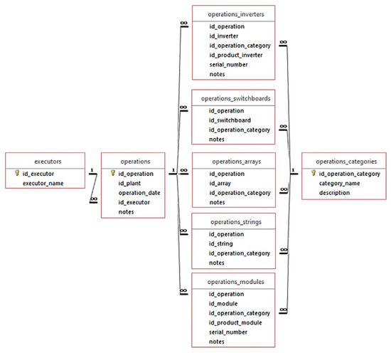The group about the operations is useful to keep track of all the operations performed on the PV plants and their components. It includes the “executors”, “operations_categories”, “operations”, “operations_inverters”, “operations_switchboards”, “operations_arrays”, “operations_strings” and “operations_modules” (Figure 9).