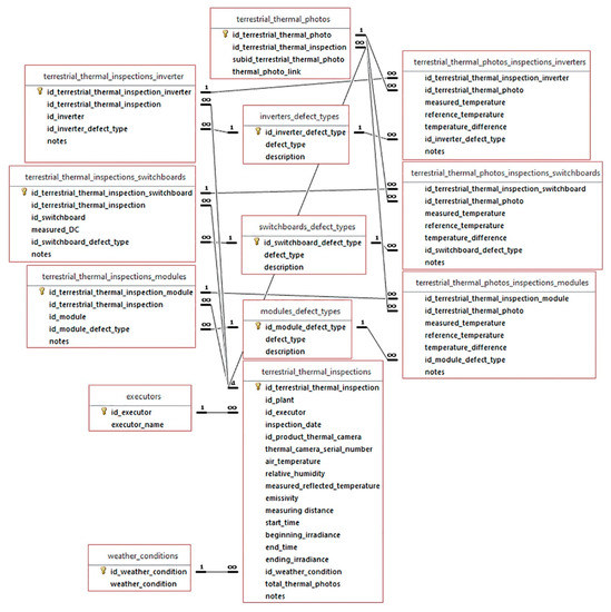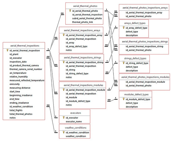 The group about the aerial thermal inspections includes all the tables needed to store all the data from the aerial thermal inspections, such as “executors”, “weather_conditions”, “aerial_thermal_inspections”, “aerial_thermal_photos”, “aerial_thermal_inspections_arrays”, “aerial_thermal_photos_inspections_arrays”,“arrays_defect_types”, “aerial_thermal_inspections_strings”, “aerial_thermal_photos_inspections_strings”, “strings_defect_types”, “aerial_thermal_inspections_modules”, “aerial_thermal_photos_inspections_modules” and “modules_defect_types” (Figure 10).