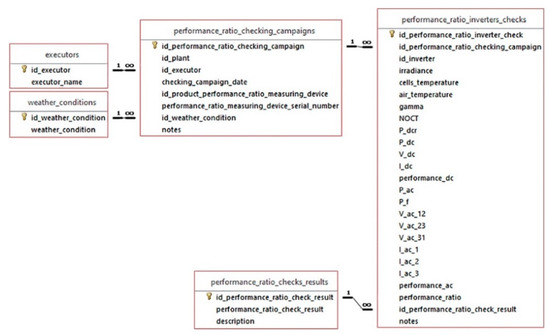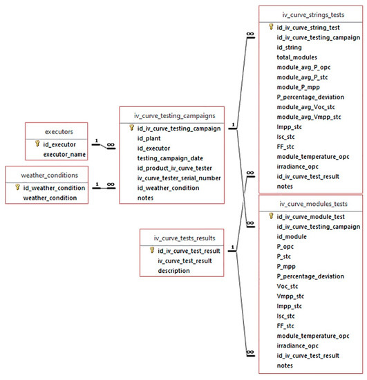 In the “iv_curve_strings_tests” and “iv_curve_modules_tests” tables are stored all the electrical measurements performed with the I–V curve tester, in compliance with the regulations [31]. These tables also provide the connection to the “iv_curve_tests_results” table containing the possible results of the I–V curve tests.