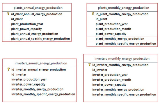The four tables in this group are able to store data on the energy produced monthly and annually and measured for whole plants and individual inverters. In each table is stored the energy produced, the rated power capacity and the specific energy produced, obtained by dividing the energy produced by the rated power capacity. All the tables of this database are stored in “SQLite” format files.