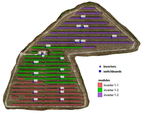 The customized map of a PV system that illustrates the positions of the inverters and switchboards and indicates which inverter the modules are connected to using different colors. (Plant B).