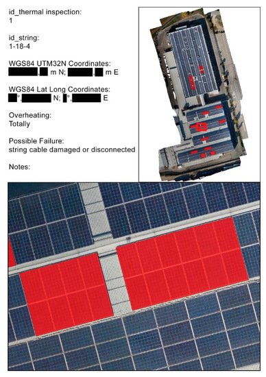 In QGIS, for selecting the necessary information from time to time, thematic reports could be drafted. A personalized report page could be generated for each selected geometry belonging to a specific layer, such as the ones from the inspection results, using the “atlas” function. Figure 17 shows a report generated by selecting the features in the “thermal_inspections_strings” table which are labeled as entirely overheated, through the “id_string_defect_type” field, and generating an “atlas” page with: a map zoomed in to the specific geometry which the page is dedicated, and general orthophoto of the PV plant with the objective feature highlighted (Plant A). It could be easily personalized with all the useful information required from the database.