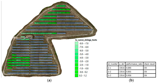 (Plant B) (a) The customized map of a PV system to show the results of the I–V curve tests. (b) The table with the results of the performance ratio check.