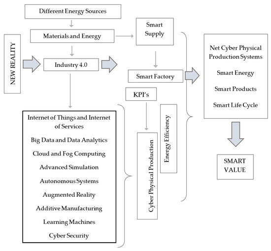 The Industry 4.0 concept provides the prerequisites for achieving sustainable production using modern information and communication technologies (ICT). A greater level of customization of production, the construction of smart factories and the networking of the economy are intended to help to manage resources more economically, including energy. Better adaptation of production to demand (consumer requirements) and the use of smart technologies in production and logistics reduces waste in various areas of activity (including unnecessary transport, failures, defective products, high operating costs, etc.) [7,8].