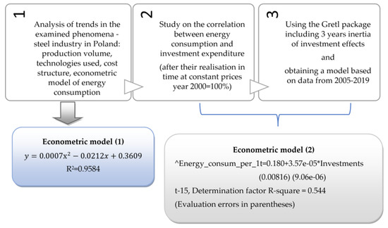 To verify the study hypotheses, data on (discounted and actual) investment values and energy consumption per 1 tonne of steel production in Poland in the period 2000–2019 were used. The statistical data used in Table 1 on energy consumption by the steel industry in Poland comes from the Polish Steel Association in Katowice, Poland and the Central Statistical Office.