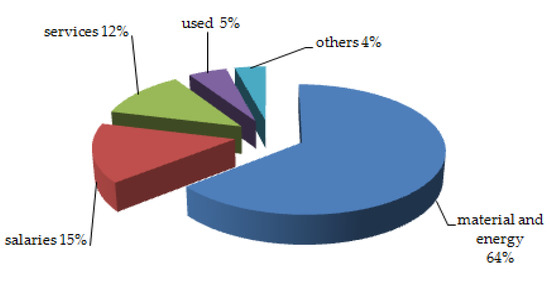 The steel industry is very energy intensive. The costs of material and energy consumption account for about 64% of total production costs (Figure 3), other costs are: about 15% for employee wages and employee benefits, 12% for external services, 5% for depreciation, and 4% are other costs [54,55] (see Figure 3).