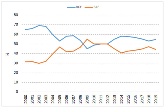 Nowadays, changes in investment policy in the steel sector are based on the substitution of electricity, e.g., chemical energy and furnace heat recovery. This technology is popular in steel production because it is based on secondary raw materials (scrap) and not on natural ones. The entire steel industry in Poland is based on two technologies: electric arc furnace (EAF) and basic oxygen furnace (BOF) [56]. The increase in the share of EAF technology in steel production in Poland is shown in Figure 4. Both key technologies have almost the same share of total steel production in recent years. The steel industry is energy intensive. Investments in the industry concern both technologies, which together constitute 100% of the steel produced in Poland since 2002.