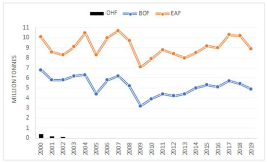 At present, the world is dominated by an orientation towards the production of steel in micro-plants, especially in countries where the volume of steel production is not significant in the global market. Until 2002, open-hearth furnace (OHF) technology was also used in Poland. Figure 5 presents the trends in steel production processes in Poland in the period from 2000 to 2019. After 2010, a decrease in leaps in the technological trends is noted [54].