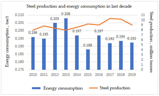 Energy consumption (intensity) and steel production in 2010–2019.