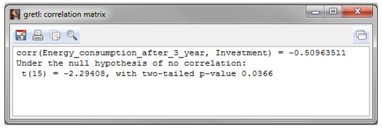 In the conducted t-Student test, a value equal to 0.3948 was obtained, which is greater than the assumed level of significance of 0.05. Therefore, from the correlation studies of the two variables, it follows that there is an insignificant positive correlation between investments and energy consumption. In the case under consideration, the correlation between investments and energy consumption was weak, therefore stronger correlations were sought by introducing a delayed response to investments into the calculations. Due to the inertia of the effects of investment in new technologies connected with Industry 4.0 and their impact on possible energy consumption per one tonne of steel produced, several models of correlation up to and including a fourth delay were examined. The simulations show that the strongest, and at the same time, the most significant correlation is between the investment and the decrease in energy consumption per one tonne after 3 years from the time the investment was made. Therefore, it can be seen that the current year’s investments may have a significant effect on reducing energy consumption only 3 years after their introduction. The value of the correlation is then equal to r = −0.50963511. A “p” value equal to 0.0366 was obtained in the correlation test, which is lower than the assumed significance level of 0.05, so the assumption of no significant correlation is rejected (Figure 7).