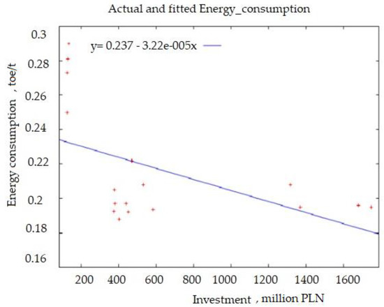 In the model presented, significant relationships between non-delayed investments and energy consumption were identified, provided the trial period is shortened. The above model is based on data from 2005–2019 and not, as initially assumed, from the beginning of the 2000–2019 period. The model estimated from 2005–2019 has a 54.4% fit and the model estimated on the basis of the original time period was only 4.05%, i.e., slightly low. Figure 10 presents a graph of both variables for the adopted econometric model. The equation of the econometric model is as follows: