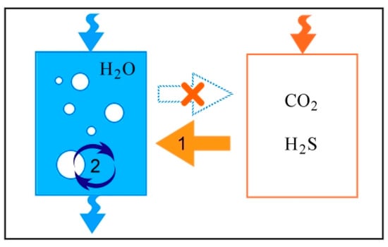 The physics of the injection is shown in Figure 2. There are two different types of interaction between phases. Interaction 1 is one-directional from the NCG-injection-feed into the water, while the other one is bidirectional for all components, including CO2, H2S and the water. All thermodynamic approaches are limited to type 2, which is based on the full equilibrium state, and both phases are allowed to receive and release any of the mixture components until the equilibrium is achieved and it is not recommended to use those ones with the composition of the NCGs as input. Thus, the main advantage of the proposed model compared to the thermodynamic ones is that it covers both types of interactions, especially the type 1, in which the fresh feed of NCG (with a fixed composition) is injected into the water by the driving force of pressure. Another advantage of the model compared to the previous correlations in the literature is that it is applicable not only for the pure gas injection, but also for the mixture of CO2 and H2S.