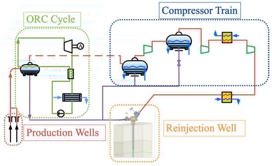 In the present research, the final case study is defined according to the full reinjection scenario of the geothermal power plants located in the Larderello area of Italy. The resource conditions are characterized by a saturated vapour condition at a pressure within the 60–80 bar range, and 280 °C temperature at about 3500 m depth. At the wellhead, the expected resource conditions are 10.3 bar pressure and 180 °C temperature. The NCG mass content is estimated at about 8%, of which about 7.8% is CO2 and 0.2% H2S. The well layout consists of two production wells and one reinjection well. The heat is transferred to the binary-Organic Rankine Cycle (ORC) circuit, and the geothermal steam is condensed. The ORC is a recuperative power cycle using R1233zd(E) as working fluid. A three-stage compressor with intercoolers to reduce the power consumption was considered. The layout of the case study is displayed in Figure 3.
