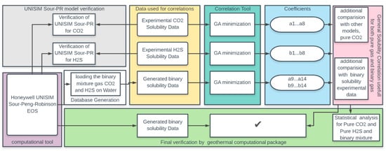 All of the mentioned studies performed a complete thermodynamic calculation using an appropriate equation of state and the related binary interaction coefficients. An alternative approach for finding the exact equilibrium concentrations in the gas-liquid mixture is direct correlations. The purpose of the present research is to derive a practical correlation for the solubility of binary CO2-H2S gas mixtures in water. The proposed correlation can be utilized not only in geothermal reinjection applications but also in other related processes such as biogas purification using water-scrubbers; this leads to saving computational time compared to frequently adopted EoS with phase equilibrium calculations. In addition, the method presented here is independent of the equation of state or external PVT database. This feature is essential for complicated models including the reinjection process []. The complexity of the model comes from the large computational domain and gird number in well modelling, and the solubility estimation is only a part of the overall one, therefore it is preferable to avoid involving complex EoS, as was done by Shafaei et al. (2012), who used a PVT program [,,]. However, in order to overcome this bottleneck, it is necessary to introduce an appropriate solubility model for the modeling of geothermal applications, geological storage or underground aquifers. The current study introduces new correlations for the solubility modelling of pure CO2, pure H2S, and the CO2-H2S mixture in water at a wide range of pressures and temperatures, which meets the requirement of geothermal modelling. The pros and cons of different solubility models are listed in Table 1.