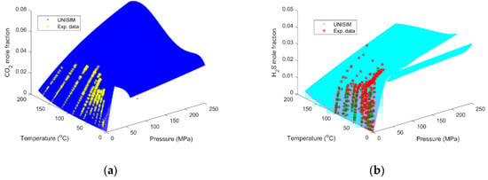 Evaluation of the UniSim® results for pure CO2 (a) and H2S (b) solubility.