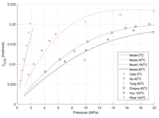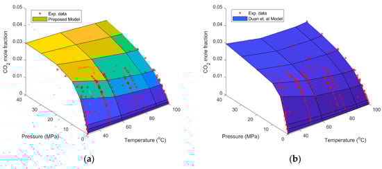 The solubility of pure CO2 is estimated by the model and compared with the experimental data (Figure 6a); the results of Duan et al. (2003), which are regarded as one of the most accepted for CO2 solubility in water, are illustrated in Figure 6b [].