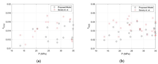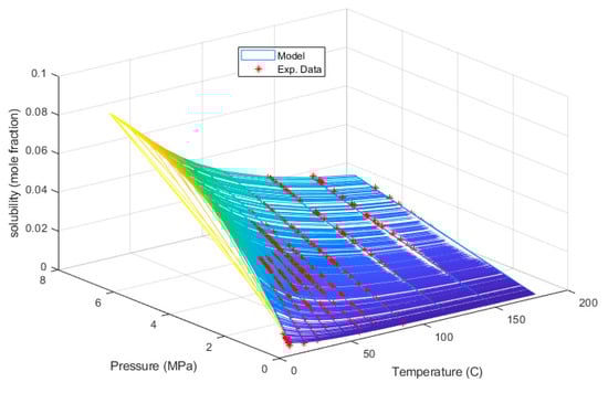 As previously discussed, the coefficients of to and to in Equations (3) and (4) are derived from a secondary database, previously validated by experimental data. In order to evaluate the binary gas solubility, the results of the proposed model are directly compared with available experimental data (Savary et al. []). As shown in Figure 9, the model results reveal a satisfactory agreement with experimental data, with an absolute deviation of 0.3% for the mixture solubility.
