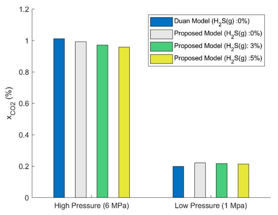 In the last part, the model reveals the impact of H2S on the solubility of CO2 as the dominant component of NCGs. In order to evaluate the extent of this effect, a case study of the total reinjection binary geothermal pilot power plant designed for the Larderello area in Italy is considered. In this case study, the NCG stream composition accounts for about 3% of H2S and 97% of CO2, and the stream is reinjected into the reservoir water. Although the mentioned amount of H2S is very low, it decreases the capacity of water to dissolve the CO2. As shown in Figure 10, the actual solubility of CO2 for the reinjection well (high pressure) is up to 0.05% lower than in the case where H2S is not present. Thus, neglecting the effect of H2S causes a significant deviation from the actual amount of dissolved CO2. However, the proposed model incorporates both the effect of H2S on the solubility of CO2 and vice versa.
